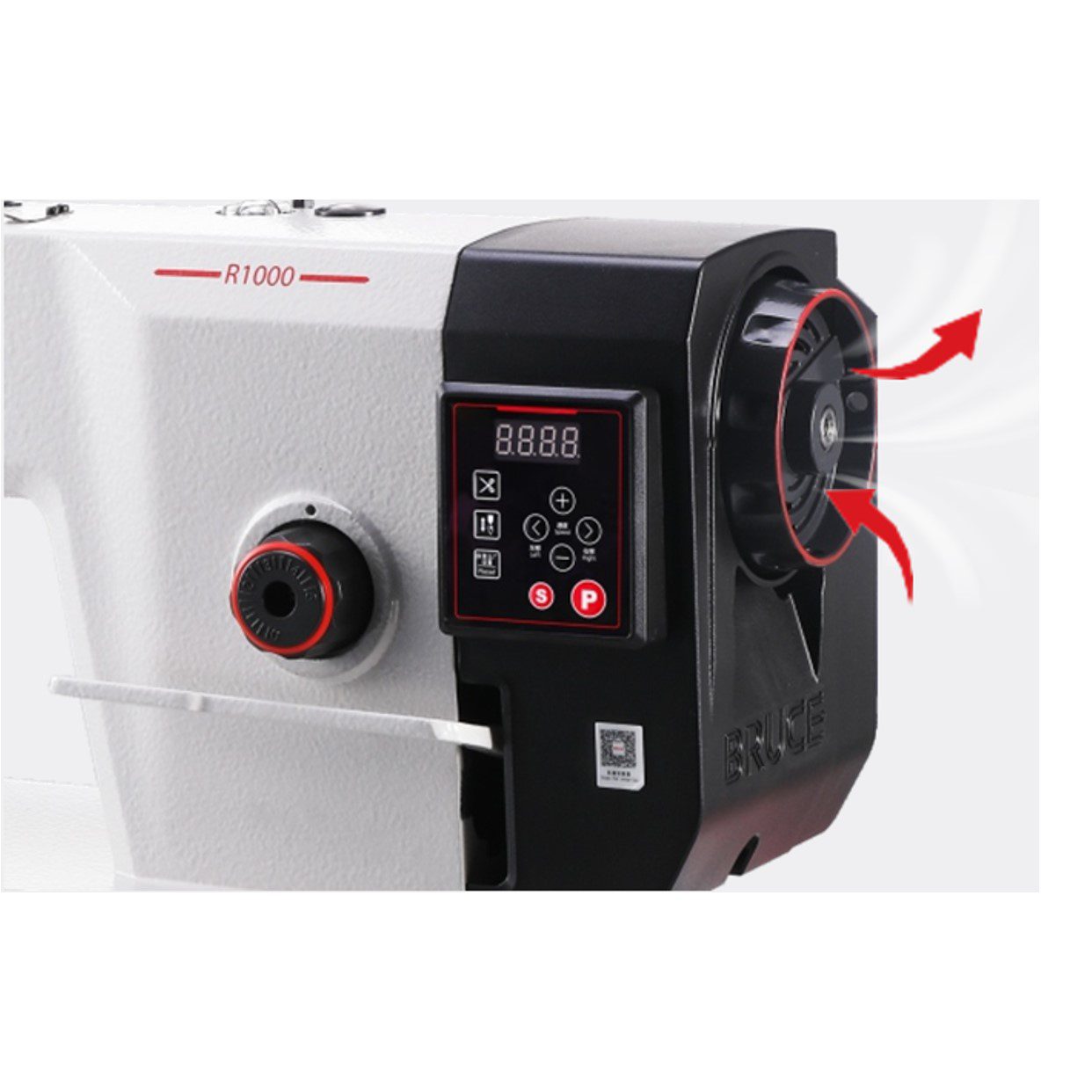 Bruce R1000 high-speed industrial sewing machine with direct drive motor, automatic thread trimmer and energy-saving technology. Ideal for garment factories and bulk stitching.