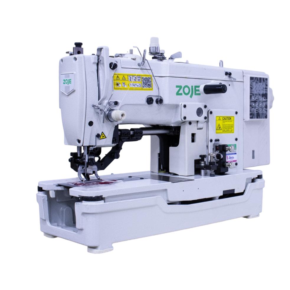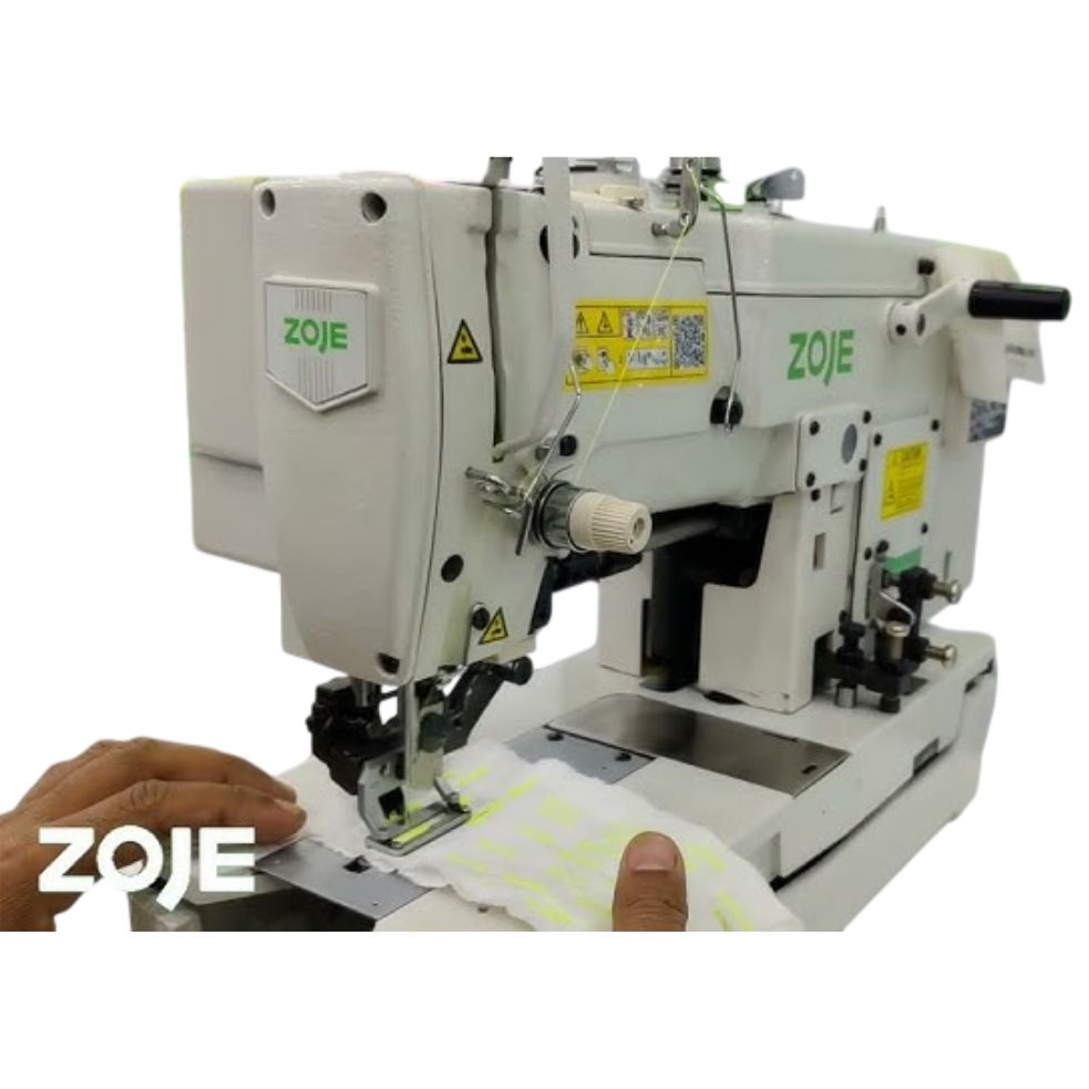 Buy the Zoje ZJ-781 industrial buttonhole sewing machine with built-in motor, thread trimmer, and safety features for precise buttonhole stitching. Ideal for apparel factories and tailoring units.